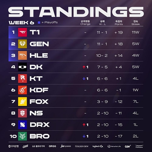 2, 3위에 랭크되어 있는 젠지와 한화생명e스포츠도 6주 차에서 연승을 이어가면서 플레이오프 티켓을 손에 넣었다. 젠지는 28일(수) 광동 프릭스를 가볍게 꺾었고 1일(금)에는 KT 롤스터를 상대로 원거리 공격형 챔피언 3개를 기용, 중후반 파괴력을 극대화시키면서 2대0으로 완승했다.