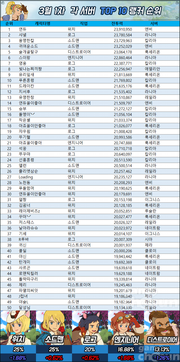 엔비 서버 '연듀'가 지난 랭킹에 이어 3월 1차 개인 랭킹 전 서버 전투력 1위를 차지했다. 연듀의 전투력은 655,655 상승한 23,910,950으로 2,400만을 눈 앞에 두고 있다. 라니아 서버 로그 '샤넬'은 칼리아 서버 소드맨 '용맹한칼'을 추월해 다시 2위로 올라섰으며, 연듀를 전투력 13만 차이로 쫓고 있다. 샤넬은 지난 랭킹 대비 전투력을 100만 가량 상승시킨 만큼 1위를 충분히 넘볼 수 있는 상황이 되었다.