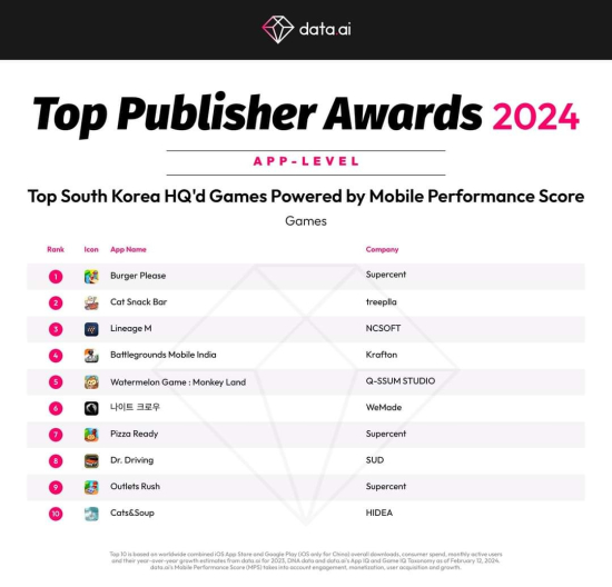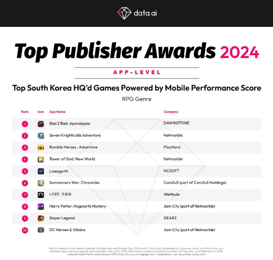 올해로 13회 째를 맞는 ‘상위 퍼블리셔 어워드’는 2012년부터 매출을 기준으로 전 세계에서 가장 성공적인 모바일 퍼블리셔를 선정해왔다. 특히 이번 어워드는 다운로드, 수익, 참여도, 성장률 등 총 모바일 성과를 기준으로 수상 게임을 선정했다.