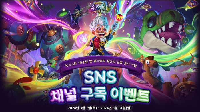 한편, 하스스톤의 10주년과 위즈뱅의 장난감 공방 출시를 기념해 진행되고 있는 SNS 채널 구독 이벤트 또한 풍성한 보상으로 커뮤니티의 주목을 받고 있다. 하스스톤 공식 유튜브, 치지직, 아프리카TV, 네이버 게임 라운지 채널을 구독하는 모든 팬들에게 신규 확장팩 카드 팩 4개를 지급하며, 추가로 랜덤 추첨을 통해 선정된 50명에게는 위즈뱅의 장난감 공방 묶음 상품을 증정한다. SNS 채널 구독 이벤트는 오는 3월 31일까지 공식 웹사이트의 이벤트 페이지에서 참여할 수 있다.