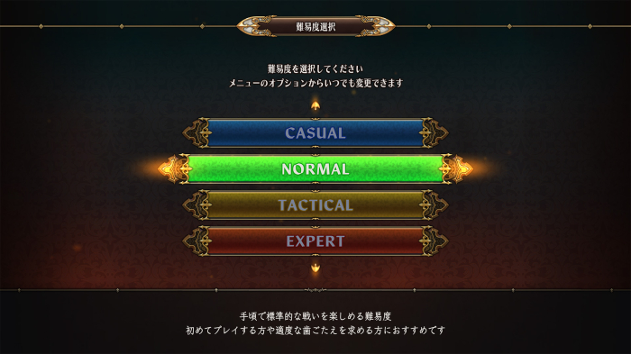 전투 난이도는 'CASUAL', 'NORMAL', 'TACTICAL', 'EXPERT' 4종류 중에서 선택할 수 있어 시뮬레이션 RPG 초보자부터 상급자까지 즐길 수 있다.