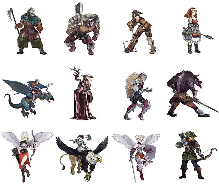 동료 캐릭터는 60명 이상이며 인간, 엘프, 수인, 천사 등 다양한 종족으로 구성되어 있다. 병종 또한 60종류 이상에 달한다.