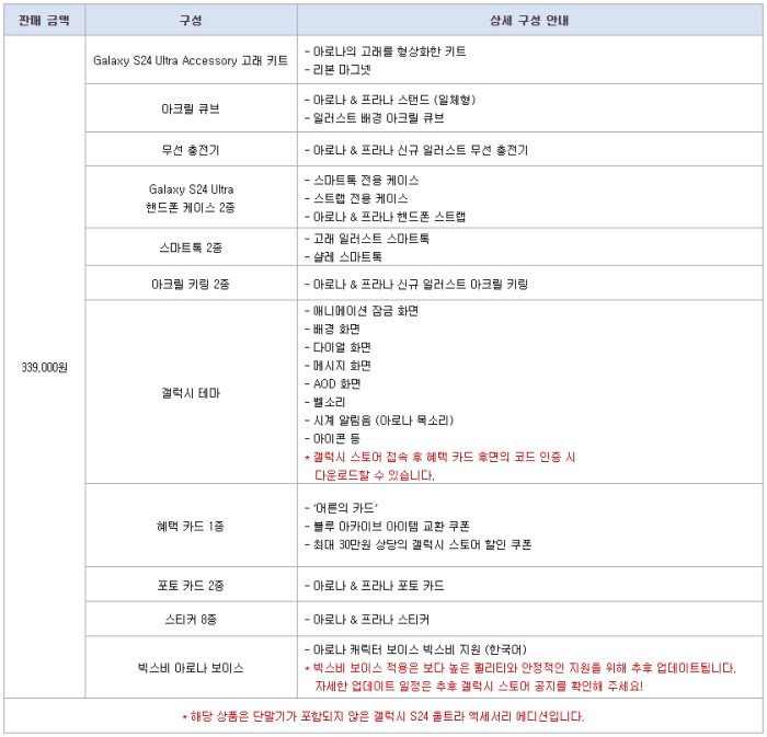 이번 상품은 갤럭시 S24 울트라에 사용할 수 있는 액세서리로 구성됐으며, 단말기는 포함되지 않았다. 주요 구성품으론 갤럭시 S24 울트라 액세서리 고래 키트, 아크릴 큐브, 무선 충전기, 핸드폰 케이스, 갤럭시 테마 등이 있다. 또한 블루 아카이브 게이머들을 위한 교환 쿠폰을 통해 청휘석 1,200개와 AP 300 등 인게임 아이템이 제공된다.