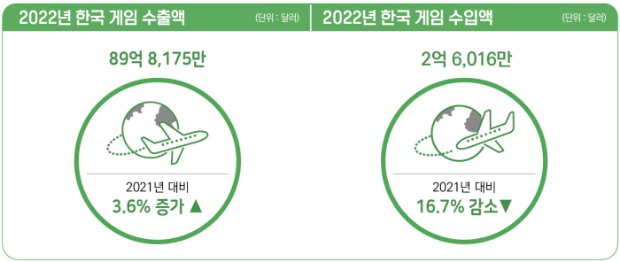 2022년 한국 게임산업 수출액은 전년 대비 3.6% 증가한 89억 8,175만 달러(한화 약 11조 6,039억 원)를 달성하였다. 수출액 비중은 중국(30.1%), 일본(14.4%), 동남아(14.2%), 대만(12.0%), 북미(11.5%), 유럽(9.8%), 중동(2.6%), 남미(2.2%) 순서로 나타났다. 수입액은 16.7% 감소하여 2억 6,016만 달러(한화 약 3,574억 원)로 집계되었다. 전년 대비 대만으로의 수출 비중은 5.6%P, 일본으로의 수출 비중은 3.9%P 각각 상승했지만, 중국 수출 비중은 4.0%P 감소하였다.