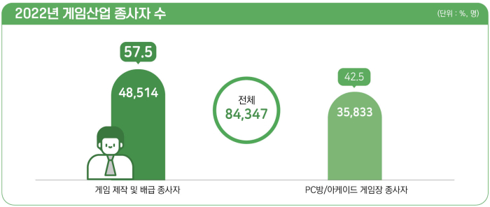 2022년 국내 게임산업 종사자 수는 총 84,347명으로 이는 2021년 대비 3.0% 상승한 것으로 파악되었다. 게임 제작 및 배급업 종사자 수는 48,514명(57.5%), 게임 유통업 종사자 수는 35,833명(42.5%)이며, 지난 2021년에 이어 게임 제작 및 배급업 종사자 수가 유통업 종사자 수보다 많은 것으로 나타났다.