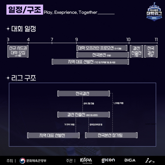 올해 이스포츠 대학리그 일정은 3월 시드권 팀의 자격 신청부터 본격적으로 시작한다. 3~5월에는 지난해 시드권 팀의 자격 갱신과 추가 신청을 진행하고, 7~8월에는 지역별 대표 선발전을 개최한다. 시드권 팀과 지역 대표팀의 선발이 완료되면, 9~11월 동안 해당 팀들이 참가하는 전국 본선을 진행한다. 최종적으로 이스포츠 대학 최강을 가리는 전국 결선은 11월에 진행한다. 지역대표 선발전 참가 접수는 각 지역 주관 진흥원 및 협회에서 별도 공지를 통해 진행 예정이다.