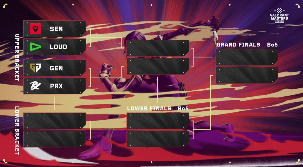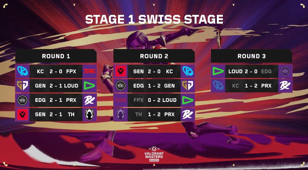 19일 진행된 스위스 스테이지 3라운드를 끝으로 브래킷 스테이지에 오른 팀이 모두 결정됐다. 2승 0패를 기록하며 일찌감치 자리를 확보한 젠지, 아메리카스 1번 시드인 센티널즈와 2승 1패를 기록한 퍼시픽 2번 시드인 페이퍼 렉스, 아메리카스 2번 시드인 라우드 등 4개 팀이 마스터스 마드리드 우승 트로피를 놓고 경쟁한다.