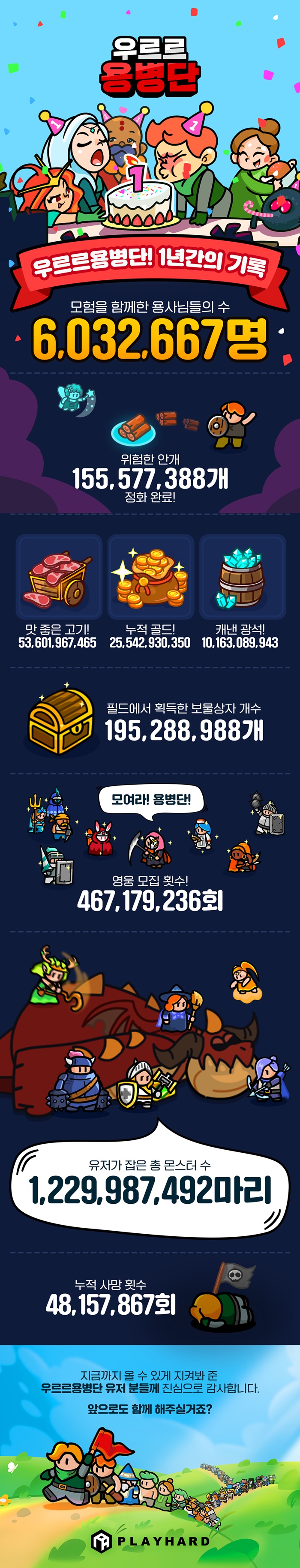 [자료제공 = 넵튠] 넵튠의 자회사 플레이하드(대표 신중혁)는 모바일 캐주얼 롤플레잉 게임 ‘우르르용병단’ 서비스 1주년을 맞아 인포그래픽을 공개했다.