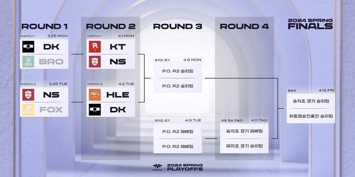 2024 LCK CL 스프링 플레이오프 2라운드부터는 14.6패치가 적용되며 더블 엘리미네이션 방식으로 진행된다. 2라운드 대결에서 승리한 두 팀은 4월 8일 오후 5시에 결승 진출을 두고 3라운드를 치른다. 또한 2라운드에서 패배한 두 팀은 4월 9일 오후 5시에 최종 결승 진출전을 두고 대결한다. 최종 결승 진출전은 4월 11일 오후 5시, 결승전은 4월 12일 오후 5시에 열릴 예정이다.
