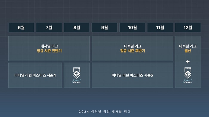 ‘이터널 리턴 내셔널 리그’는 6월부터 진행되는 ‘이터널 리턴 시즌 4’와 9월부터 진행되는 ‘시즌 5’ 기간에 걸쳐 약 6개월간 진행되며, 8주 16회의 정규 시즌 경기와 1회의 결선 경기로 구성된다. 결선 경기는 12월 중 대전 이스포츠 경기장에서 진행될 예정이다.