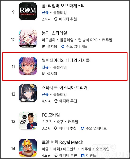 하이브IM의 2D ARPG '별이되어라2: 베다의 기사들'이 구글 플레이스토어 매출 11위를 기록하며 흥행 호조를 보이고 있다.