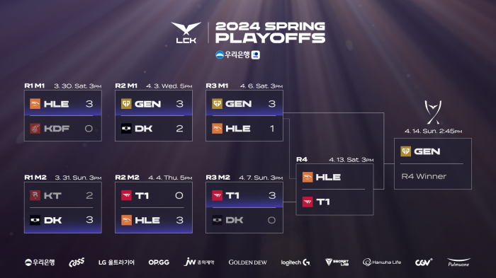 '리그 오브 레전드(LoL)' 이스포츠의 한국 프로 리그를 주최하는 리그 오브 레전드 챔피언스 코리아(대표 오상헌, 이하 'LCK')는 3일(수)과 4일(목), 6일(토)과 7일(일) 서울 종로구 그랑서울 롤파크에 위치한 LCK 아레나에서 열린 우리은행 2024 LCK 스프링 플레이오프 결과 젠지가 디플러스 기아와 한화생명e스포츠를 연파하면서 결승 티켓을 가장 먼저 손에 넣었다고 밝혔다.