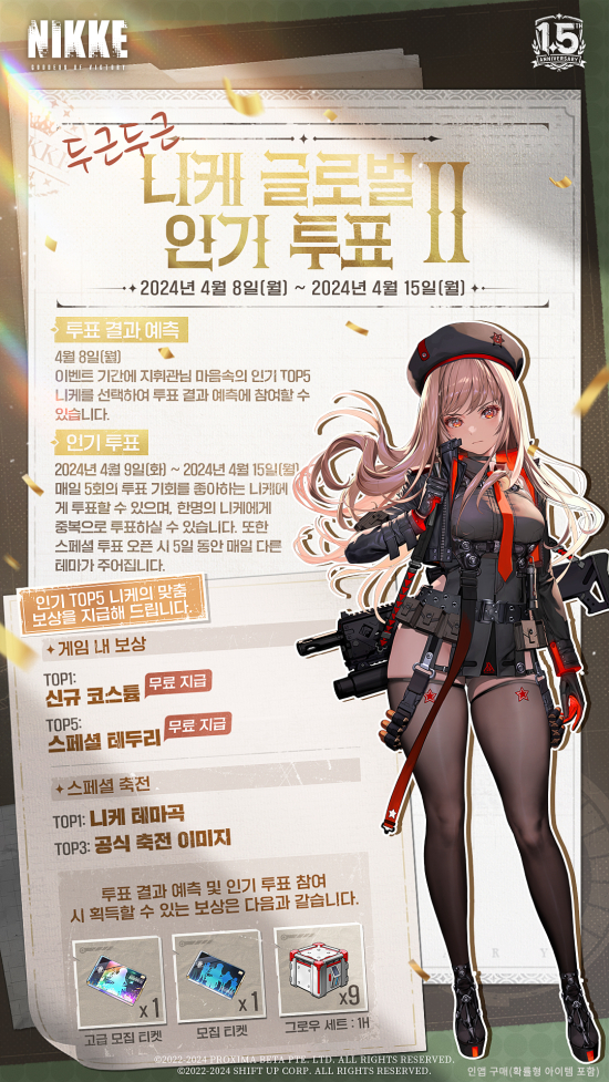 또한, 4월 8일부터 4월 15일까지 인기 캐릭터 TOP5를 선정하는 두근두근 제2회 니케 글로벌 인기투표 이벤트가 공식 사이트에서 진행되며, 투표에서 TOP5를 차지한 니케(캐릭터)의 스페셜 테두리 및 1위에 등극한 니케의 신규 코스튬을 무료로 선물할 예정이다.
