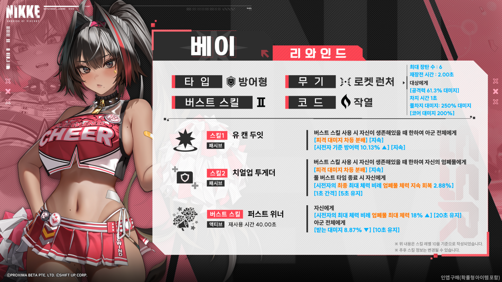 '레벨인피니트'가 서비스하고, '시프트업'이 개발한 '승리의 여신 : 니케'가 치어리더 콘셉트의 신규 SSR 니케 '베이'의 스킬 정보를 공개했습니다.