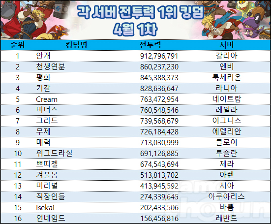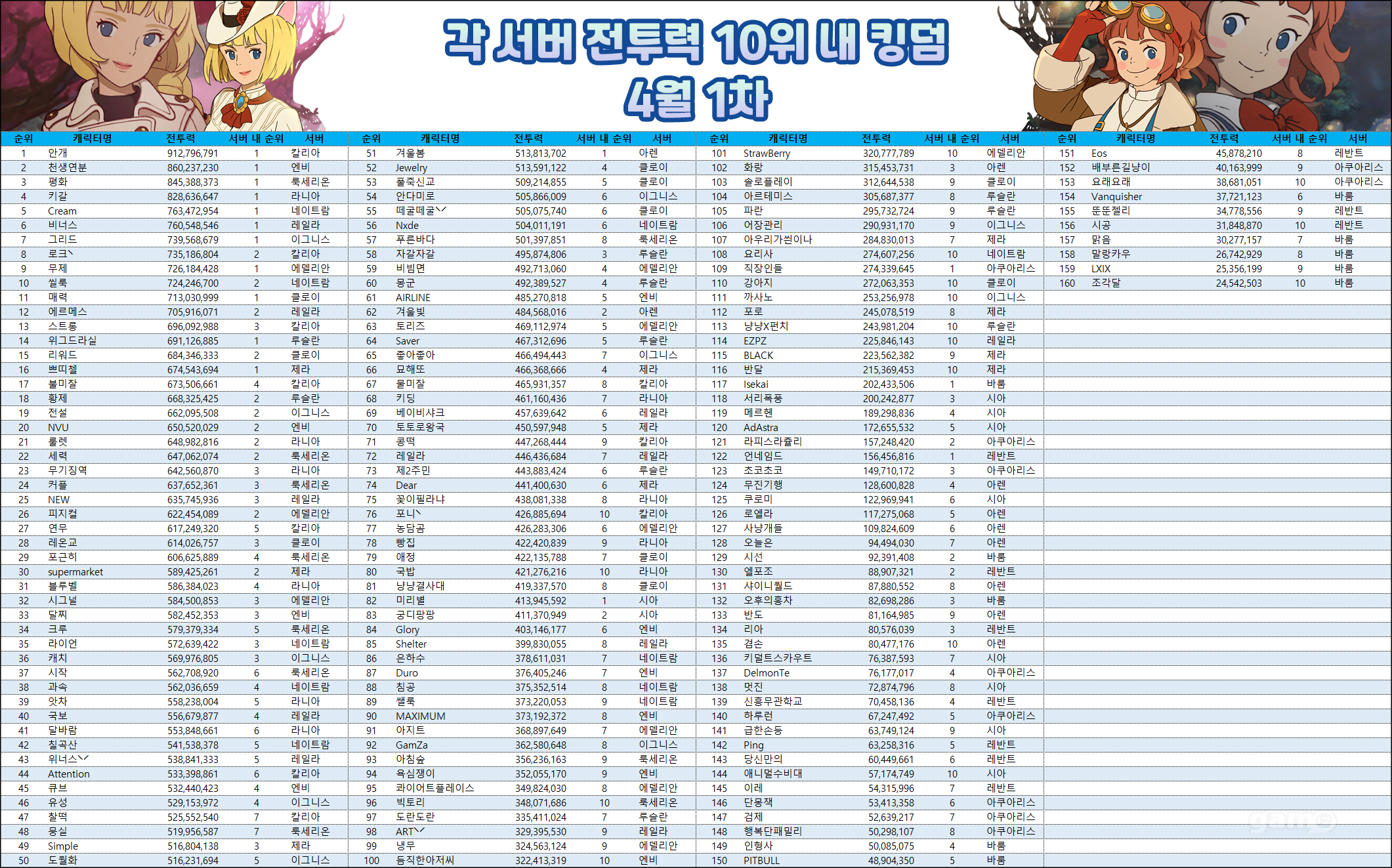 4월 1차 킹덤 랭킹 전 서버 1위는 칼리아 서버 '안개' 킹덤이다. 전투력은 34,288,852 상승한 912,796,791로 2위 엔비 서버 '천생연분' 킹덤과 차이는 52,559,561이다. 안개 킹덤의 급격한 전투력 상승, 천생연분 킹덤과 라니아 서버 '키갈' 킹덤의 순위 교체로 인해 독보적인 1위가 등장한 것이다.