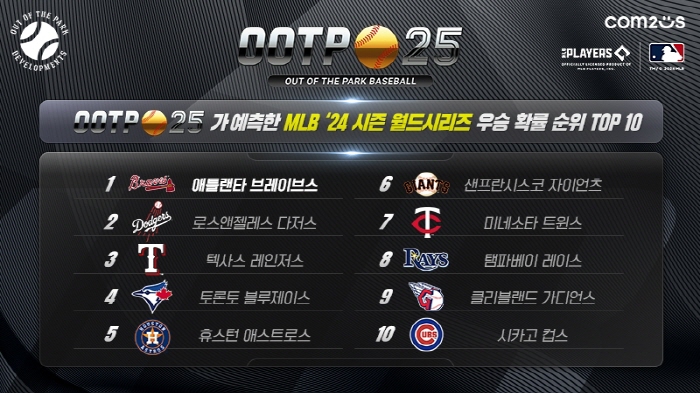 컴투스(대표 남재관)는 자회사 ‘아웃 오브 더 파크 디벨롭먼츠(Out of the Park Developments)’의 MLB, KBO 공식 라이선스 야구 게임 ‘아웃 오브 더 파크 베이스볼 25(이하 OOTP 25)’가 진행한 2024 야구 리그 시뮬레이션 결과를 공개했다.
