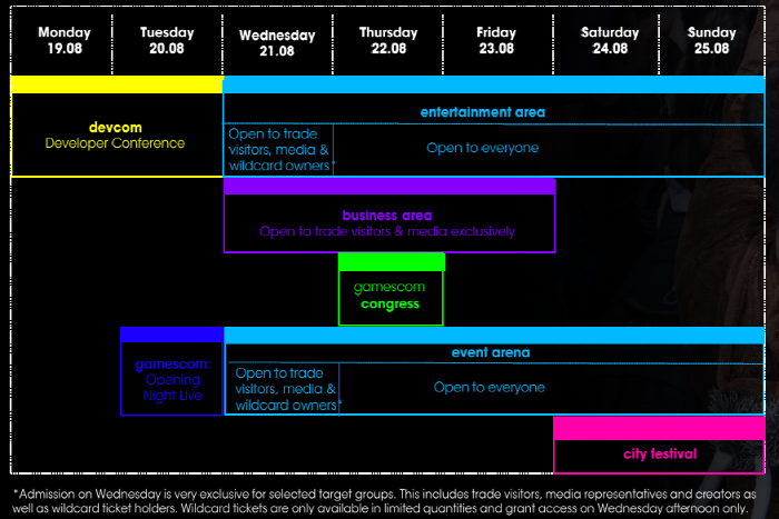 B2B 방문객 및 언론인은 8월 21일부터 입장 가능하며, 22일부터 일반 방문객도 입장할 수 있다. 단, 와일드카드를 구매한 일반 방문객은 21일부터 입장이 가능하다.
