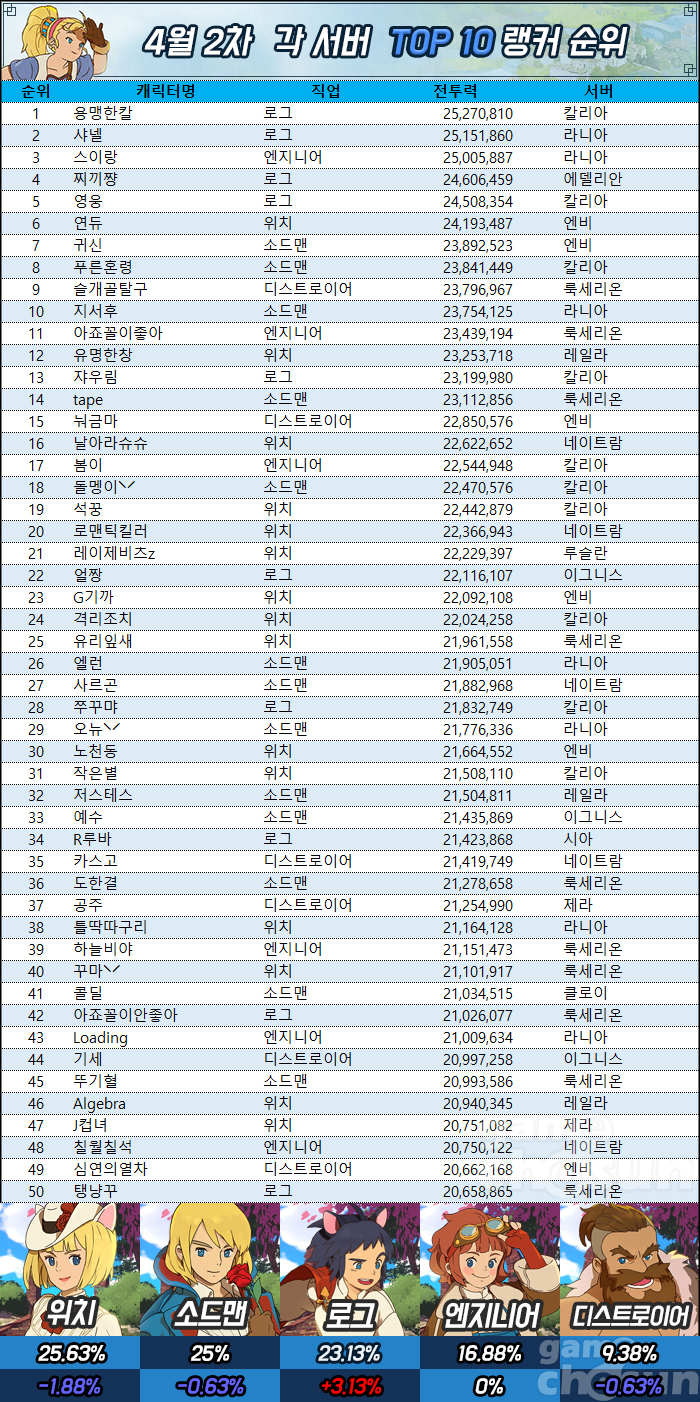 각 직업별 최고 순위 달성자와 순위는 다음과 같다. 로그는 칼리아 서버 용맹한칼이 1위, 엔지니어는 라니아 서버 스이랑이 3위, 위치는 엔비 서버 '연듀'가 6위, 소드맨은 엔비 서버 '귀신'이 7위, 디스트로이어는 룩세리온 서버 '슬개골탈구'가 9위다. 단, 로그 1위를 기록한 용맹한칼은 그동안 소드맨으로 집계되었으며, 만약 용맹한칼을 소드맨 랭커로 고려할 경우 로그 1위는 라니아 서버 '샤넬'이 된다.