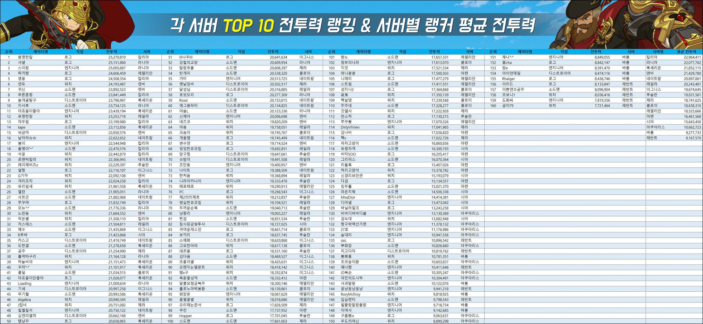 - 집계는 17일 16시부터 약 1시간 동안 실시됐으며, 누적 랭킹 메뉴의 캐릭터 전체 랭킹 항목을 기준으로 각 서버 상위 10명까지 선별했습니다. 집계 시간 동안 랭커들의 활동에 따라 전투력 및 직업에 오차가 발생할 수 있습니다.