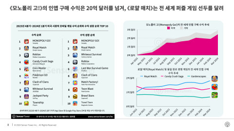 2023년 4분기부터 2024년 1분기까지 미국 시장의 모바일 게임 수익 순위와 수익 성장 순위에서도 ‘모노폴리 고!’의 성과가 눈에 띈다. ‘모노폴리 고!’의 인앱 구매 수익은 20억달러를 넘기며 수익 순위와 수익 성장 순위 모두에서 1위를 차지했다. 전 세계 모바일 퍼즐 게임 선두를 달리는 ‘로얄 매치’는 각 순위에서 2위 자리에 올랐다.