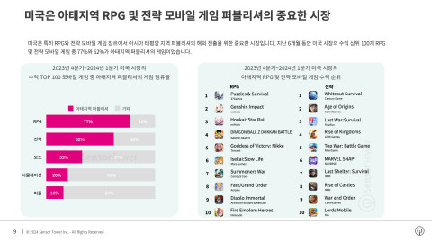 미국은 특히 RPG와 전략 모바일 게임 장르에서 아시아 태평양 지역 퍼블리셔의 해외 진출을 위한 중요한 시장이다. 지난 6개월 동안 미국 시장의 수익 상위 100개 RPG 및 전략 모바일 게임 중 77%와 62%가 아태지역 퍼블리셔의 게임이었다.