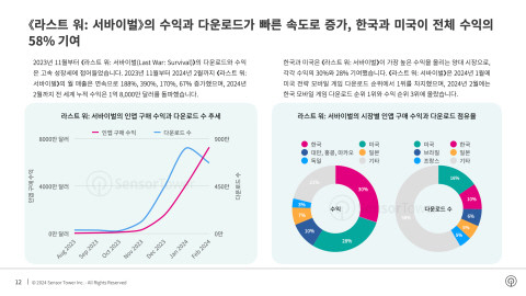 한국과 미국은 ‘라스트 워: 서바이벌’이 가장 높은 수익을 올리는 양대 시장으로, 각각 수익의 30%와 28% 기여했다. ‘라스트 워: 서바이벌’은 2024년 1월에 미국 전략 모바일 게임 다운로드 순위에서 1위를 차지했으며, 2024년 2월에는 한국 모바일 게임 다운로드 순위 1위와 수익 순위 3위에 올랐다.