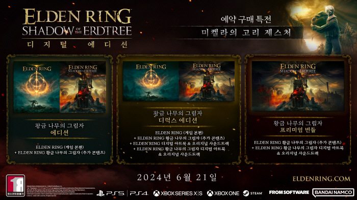 ‘ELDEN RING 황금 나무의 그림자’의 다운로드 버전은 현재 PlayStation®5, PlayStation®4, Xbox Series X|S, Xbox One, Steam® 모든 플랫폼에서 예약 구매할 수 있다. DLC 단품뿐만 아니라, DLC 플레이에 필요한 게임 본편을 포함한 특별 번들도 준비되어 있다.
