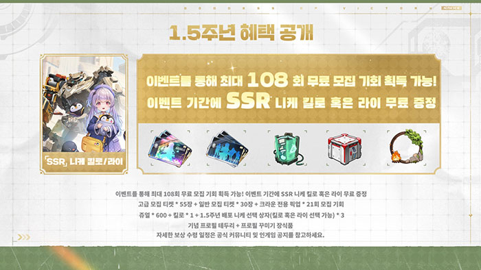 본문에서 소개한 신규 니케 '크라운'은 물론이고, 접속자 전원에게 1.5주년 무료 배포 SSR 니케, '킬로'와 '라이'를 선택할 수 있는 선택 상자를 지급하고, 준비된 다양한 이벤트를 통해 각종 모집 티켓 및 무료 뽑기 등 최대 108회 무료 모집 기회를 제공할 예정입니다.