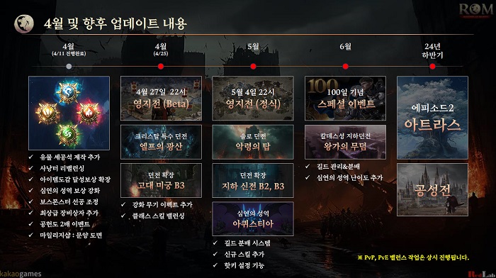한편 ‘롬’은 지난 17일 공식 커뮤니티의 ‘5차 PD 브리핑’을 통해 4월 서비스 현황과 향후 업데이트 계획에 대해 공개한 바 있다. 오는 6월 100일 기념 스페셜 이벤트를 시작으로 하반기에는 에피소드 2 : 아트라스, 공성전 등을 순차적으로 공개하여 장기 흥행을 이어갈 예정이다.