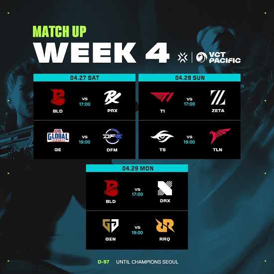 5대5 대전형 캐릭터 기반 전술 슈팅 게임 '발로란트'의 개발 및 유통사인 라이엇 게임즈(한국 대표 조혁진)는 오는 27일(토)부터 29일(월)까지 서울 강남에 위치한 코엑스 신한카드 아티움에서 진행되는 VCT 퍼시픽 스테이지 1 4주 차 경기에서 DRX가 블리드 이스포츠를 상대로 그룹 스테이지 전승에 도전한다고 밝혔다.