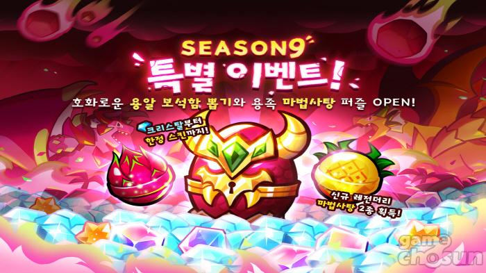 시즌9 업데이트를 기념해 다양한 이벤트를 마련했다. 먼저 레전더리 쿠키를 비롯해 보물, 크리스탈, 무지개 큐브 등 푸짐한 보상이 주어지는 ‘시즌9 특별 이벤트’가 진행된다. 또 ‘용족 마법사탕 퍼즐’을 완성하면 용과 드래곤 쿠키와 파인 드래곤 쿠키, 두 쿠키의 신규 마법사탕 재료를 획득할 수 있다.