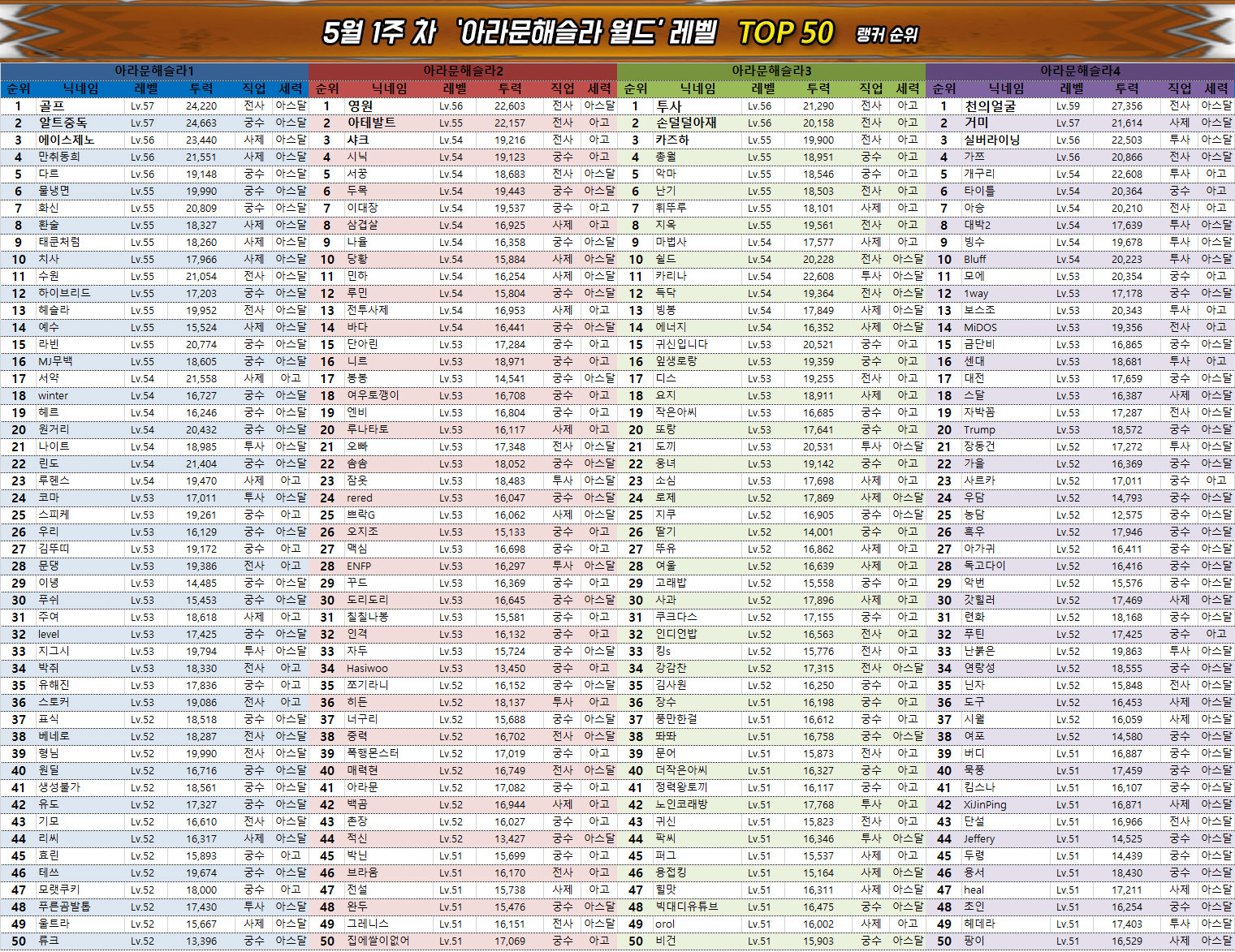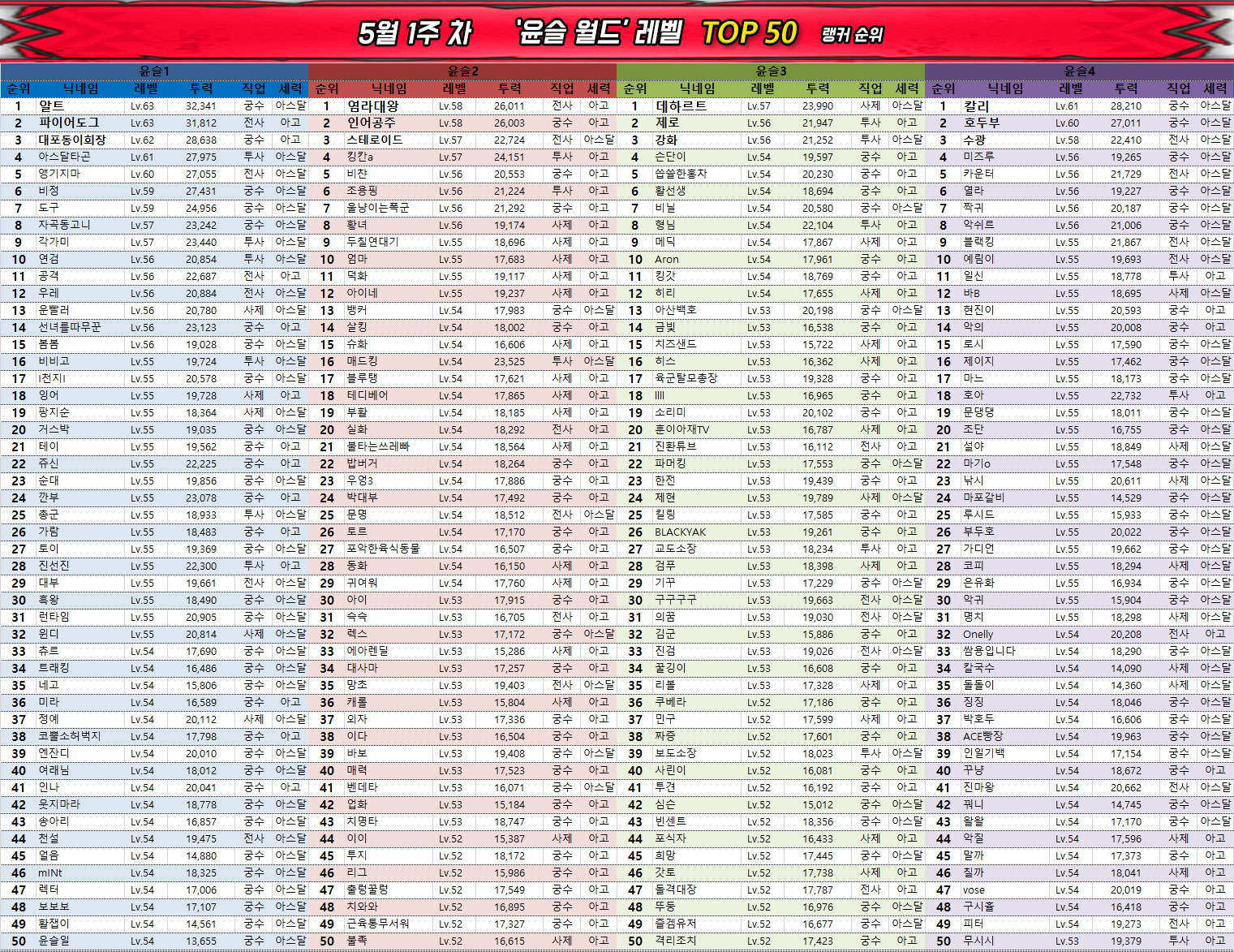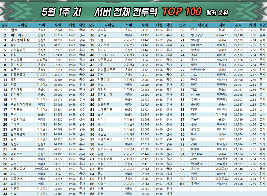 궁수 클래스에서 가장 높은 순위를 기록한 것은 역시 '알트' 유저이며, 전사는 '파이어도그' 유저, 그리고 투사는 윤슬1 서버의 '아스달타곤' 유저가 차지했다. 마지막으로 사제 클래스는 윤슬3 서버의 '데하르트' 유저가 가장 높은 전투력과 레벨을 기록했다.