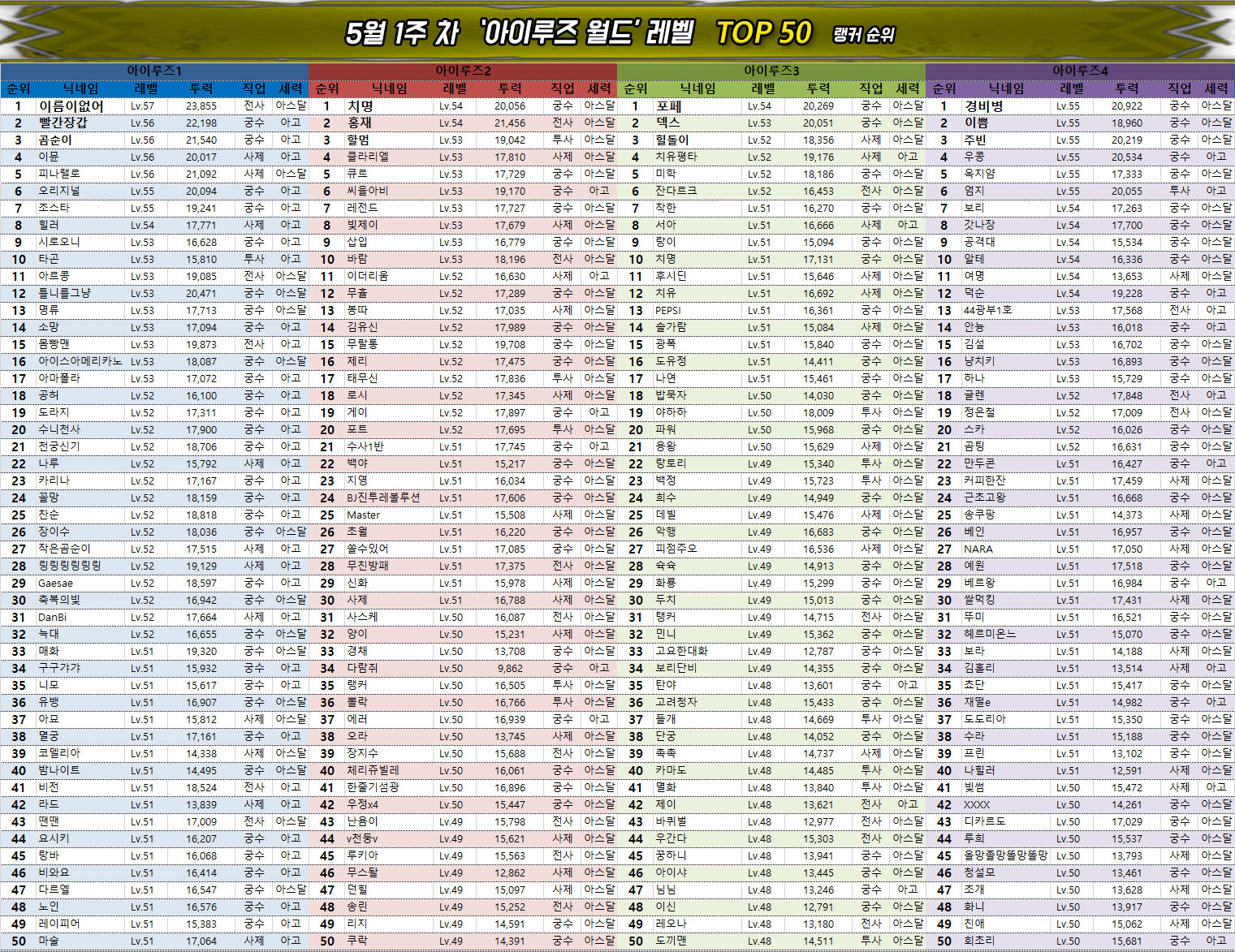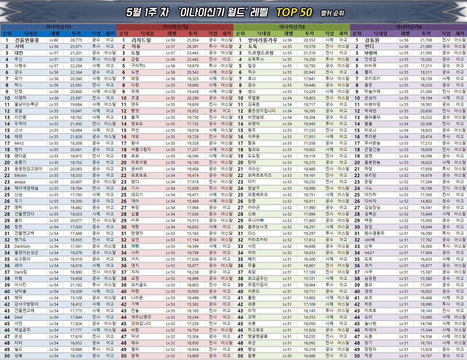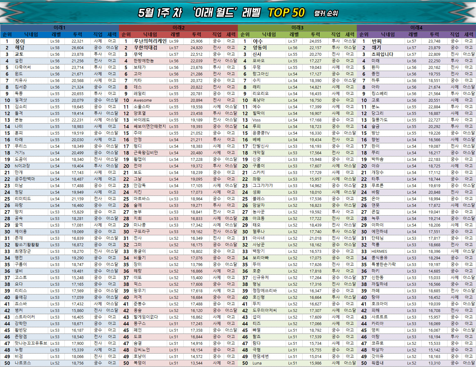 궁수 클래스에서 가장 높은 순위를 기록한 것은 역시 '알트' 유저이며, 전사는 '파이어도그' 유저, 그리고 투사는 윤슬1 서버의 '아스달타곤' 유저가 차지했다. 마지막으로 사제 클래스는 윤슬3 서버의 '데하르트' 유저가 가장 높은 전투력과 레벨을 기록했다.