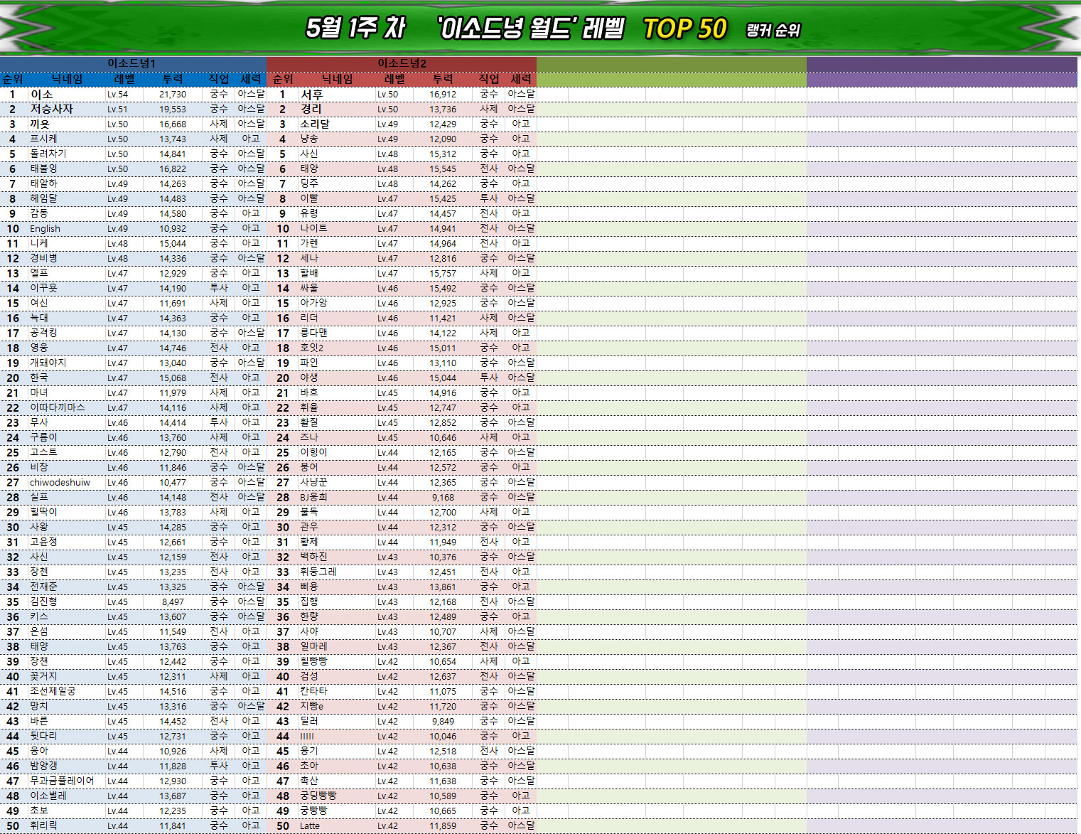 주요 서버의 1위 랭커는 54레벨을 돌파한 상태이며, 전투력도 20,000을 넘어섰다. 특히 신규 서버인 이소드녕1의 '이소' 유저는 54레벨에 전투력 21,730을 기록하면서 가장 빠르게 성장하고 있는 랭커다.