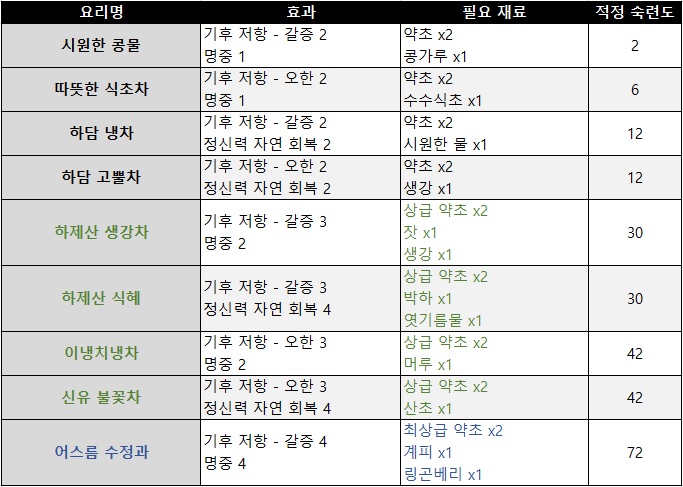 요리를 통해 획득할 수 있는 음료 중 일부는 명중을 상승시켜주기 때문에 이용자가 필요 구비해야할 핵심 버프 아이템이라 할 수 있다. 일반 음료인 시원한 콩물과 따뜻한 식초차는 각각 갈증과 오한 디버프 수치를 낮출 뿐만 아니라, 명중 1을 올려주기에 기후에 상관없이 사용하는 것을 적극 추천한다.