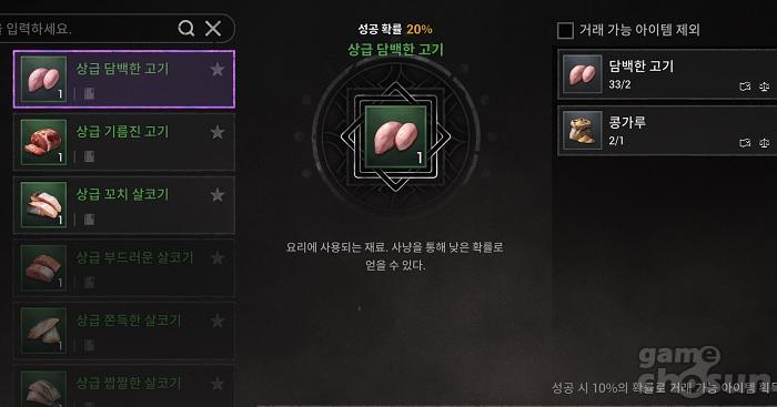 고급 등급인 상급 고기와 살코기, 약초는 일반 등급의 고기 및 살코기, 약초 2개와 함께 특정 조미료를 조합해 만들 수 있는데, 성공 확률이 존재한다. 성공 확률은 20%이기 때문에 통상적으로 2개의 상급 핵심 요리 재료를 얻기 위해서는 일반 고기 및 살코기, 약초가 각 10개가 필요하다는 계산이 나온다. 물론 추산도 지역부터 상급 재료를 얻을 수 있기는 하나, 획득 확률이 결코 높지는 않다.