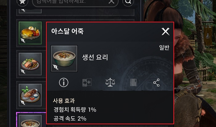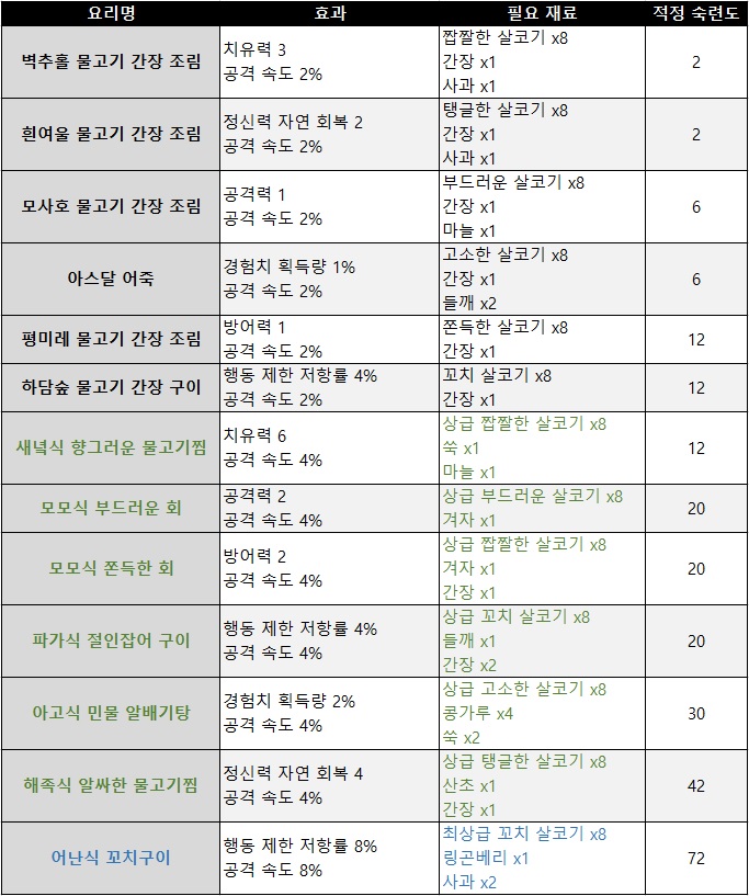 일반 생선 요리에서는 아스달 어죽을 적극 추천한다. 왜냐하면 해당 생선 요리는 공격 속도 2% 증가와 더불어 경험치 획득량 1% 증가 효과를 제공하기 때문이다. 이와 더불어 공격력 1 및 공격 속도 2% 증가 효과를 가진 모사호 물고기 간장 조림도 추천할만하다.