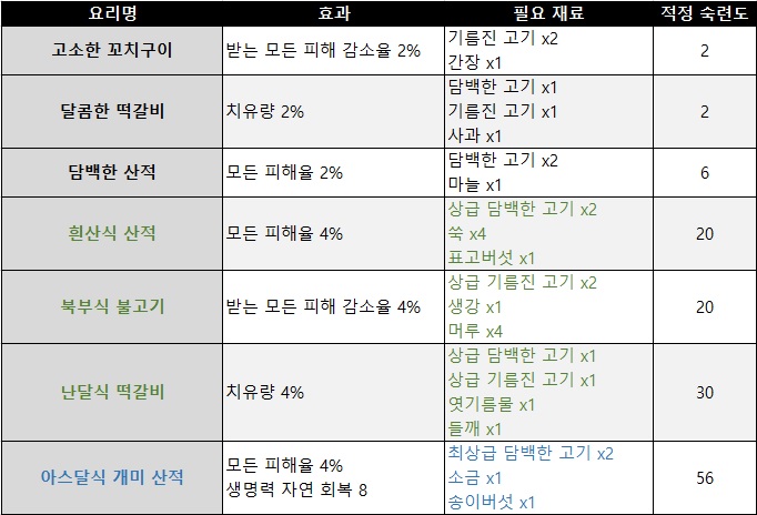 추가로 고급 고기 요리 중에는 흰산식 산적이 모든 피해율을 4% 증가시켜 주며, 희귀 등급 고기 요리인 아스달식 개미 산적은 모든 피해율 4% 증가와 더불어 생명력 자연 회복 8 옵션을 제공한다.