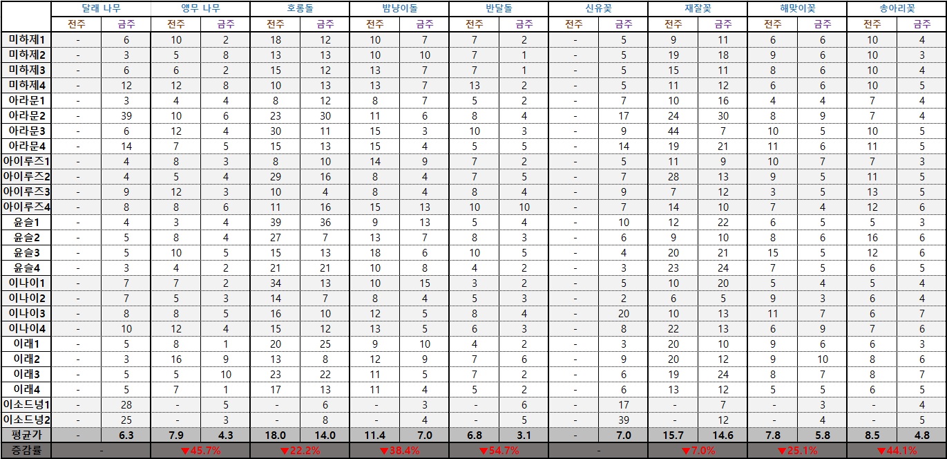 ※ 이소드녕1, 2 서버의 실시간 최저가는 '평균가' 및 '증감률'에 포함되지 않았습니다.