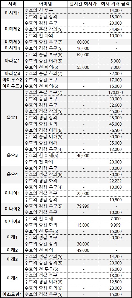 아울러 가장 많은 랭커가 포진한 '윤슬1'서버, 그리고 '아라문해슬라4'서버에서는 7강 영웅 방어구가 거래되기도 했다. 아직까지 서비스 초반인 만큼 영웅 장비의 가격은 안정화되지 않은 것으로 보이며, 충분히 시세가 하락할 가능성을 가지고 있다.