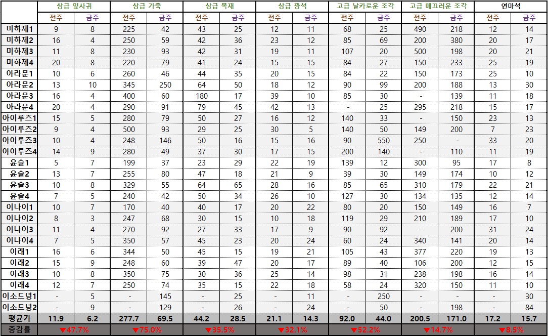상위권 이용자의 경우, 희귀 배경 등급 장비 제작을 시도하고 있는 만큼 재잘꽃과 호롱돌의 거래도 활발하며, 무기보다는 비교적 제작 난이도가 낮은 방어구 제작이 인기를 끌면서 재잘꽃은 약 7%의 시세 하락 수준을 기록했다.