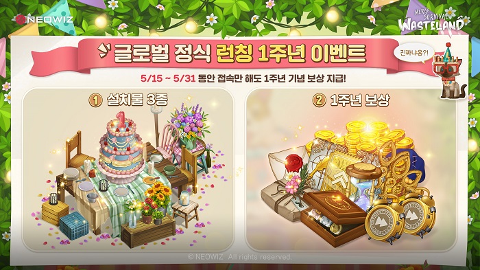 [자료제공 = 네오위즈] 네오위즈(공동대표 김승철, 배태근)는 자회사 ㈜스티키핸즈(대표 김민우)가 개발한 ‘머지 서바이벌 : 생존의 땅(이하 머지 서바이벌)’이 글로벌 정식 서비스 1주년을 기념한 업데이트를 진행한다고 14일 밝혔다.
