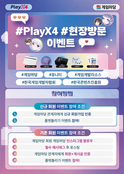 게임마당은 2024년 5월 23일부터 26일까지 나흘간 플레이엑스포에 홍보 부스로 참가할 예정이다. 룰렛 이벤트를 통해 다양한 굿즈를 제공하고 있으니 엑스포 방문 계획이 있다면 꼭 들러보자. 하반기에는 게임마당 리소스만으로 게임개발 실력을 경쟁하는 자체 게임잼도 기획하고 있다.