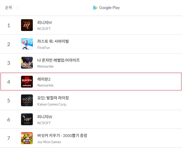 지난 5월 29일 정식 서비스를 시작해 애플 앱스토어 최고 매출 2위를 기록한 바 있는 레이븐2가 3일 구글 스토어 매출에서도 TOP5 내 진입하면서 흥행에 성공한 모습이다. 구글 스토어에는 매출 11위로 첫 진입했으며, 이후 꾸준히 순위가 상승하면서 매출 4위까지 달성한 상태다.