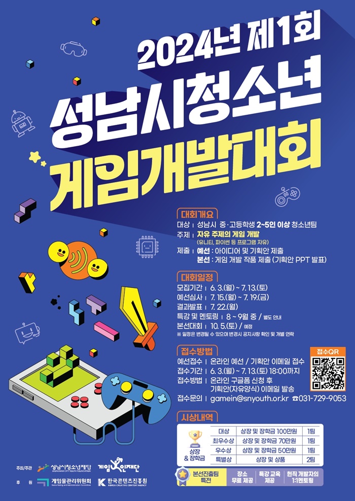 [자료제공 = 게임인재단] 재단법인 게임인재단(공동이사장 남궁훈, 이나정)과 성남시청소년재단(대표이사 최원기)이 공동 주최·주관하는 ‘2024년 제1회 성남시청소년게임개발대회’가 6월 3일(월) 온라인 접수를 시작했다.