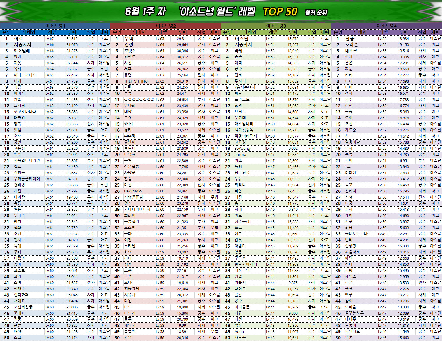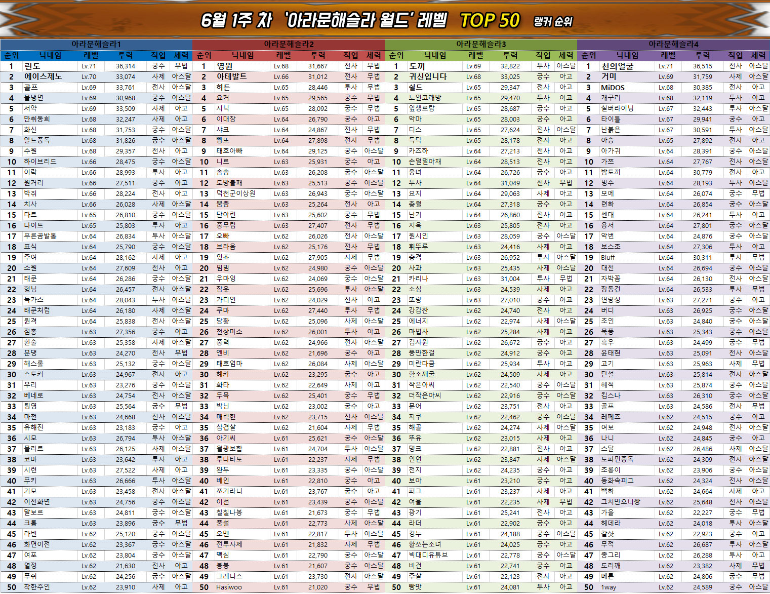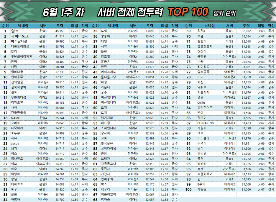 궁수와 전사, 투사 클래스 부문 1위는 각 윤슬1 서버 '알트', '파이어도그', 그리고 '아스달타곤' 유저가 차례로 차지하고 있는 가운데, 윤슬4 서버의 'NAMU' 유저가 사제 클래스 1위로 복귀하는데 성공했다.