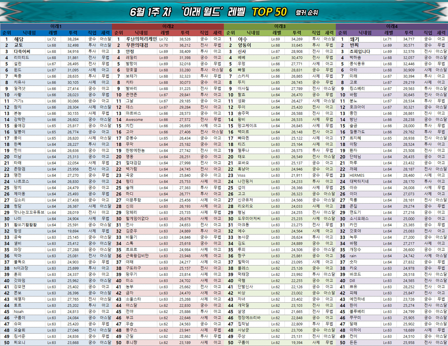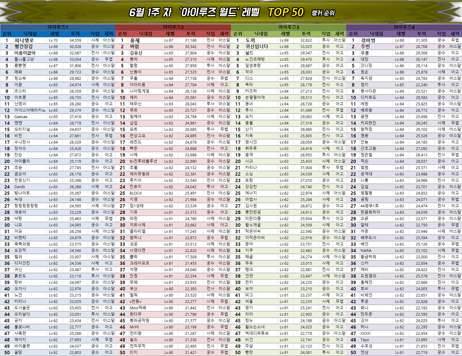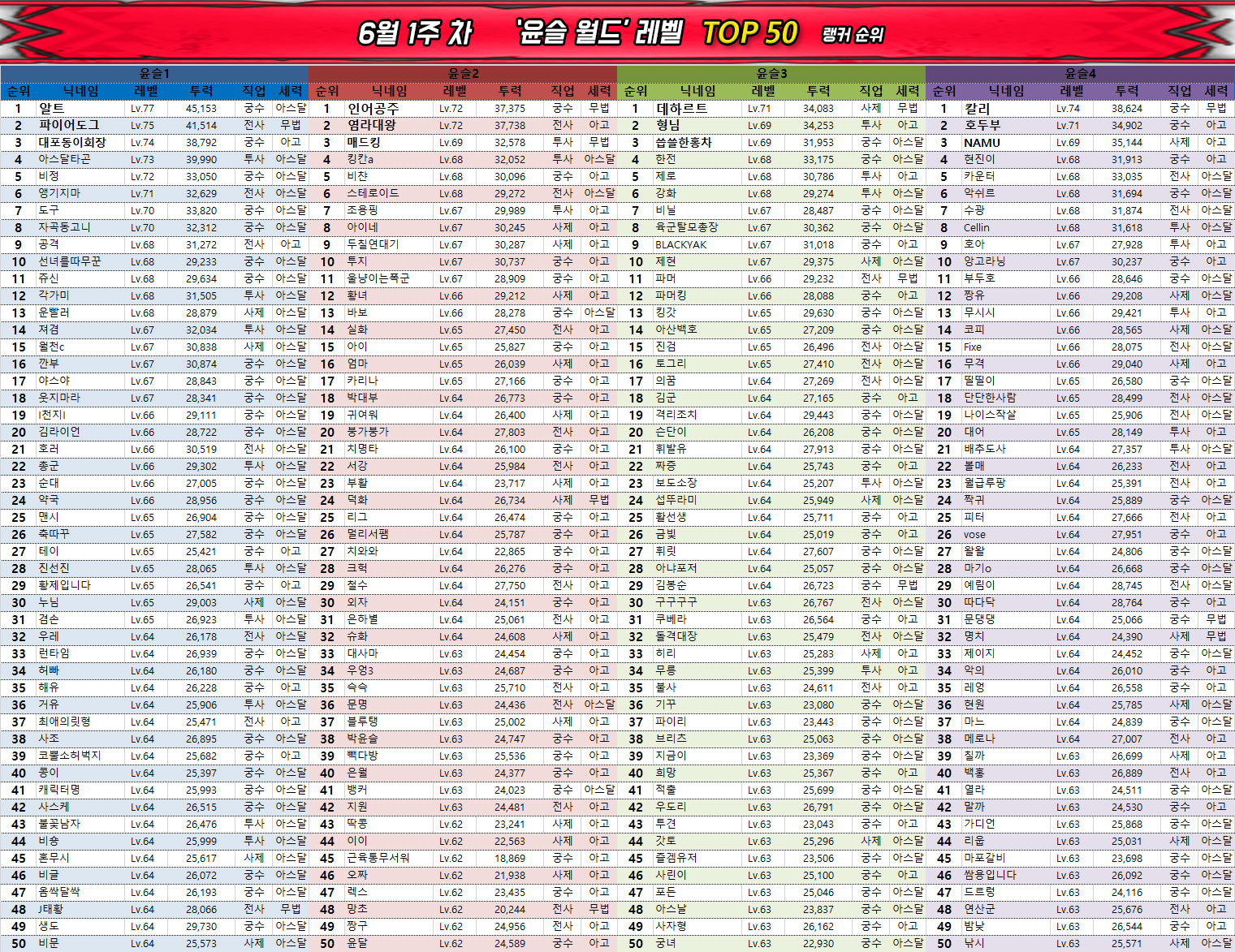 윤슬1 서버의 '알트'가 기존 레벨 랭킹 1위였던 윤슬 1서버 '파이어도그'의 레벨을 넘어서면서 전투력과 레벨 부문 모두에서 1위를 차지했다. 그는 지난주 대비 전투력을 2,000 가까이 끌어올렸으며 2위 '파이어도그'와 약 3,600 가량의 전투력 차이를 유지하고 있다.