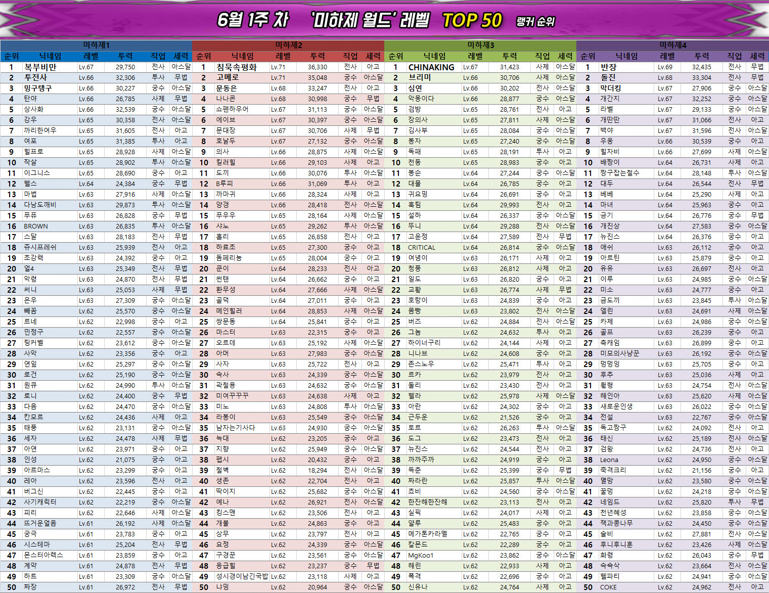 전 서버 최상위 랭커 1300명의 평균 전투력은 26,220을 기록했으며, 이는 1,810 가량 상승한 수치다. 평균 레벨은 63.6으로, 지난주 대비 2.2레벨 증가했다.