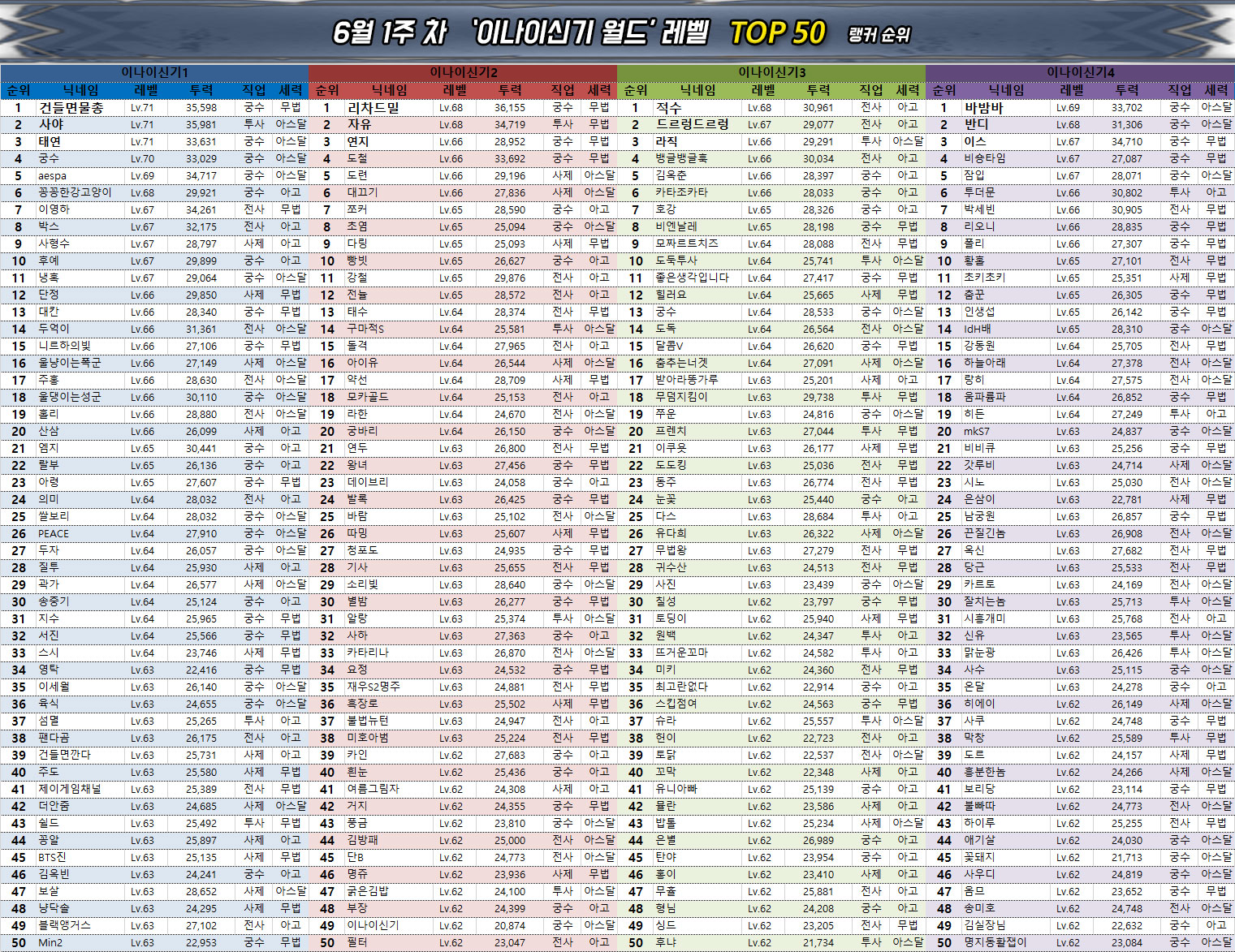 최상위 랭커가 다수 포진한 윤슬1 서버는 상위 랭커 50명의 전투력 평균이 29,278을 기록했다. 다음으로 이나이신기1 서버가 평균 전투력 27,830으로 윤슬4 서버를 따라잡았다. 평균 전투력 3위 윤슬4 서버는 27,757이며, 뒤를 이어 이래4서버와 이래2 서버가 맹추격하고 있는 중이다.