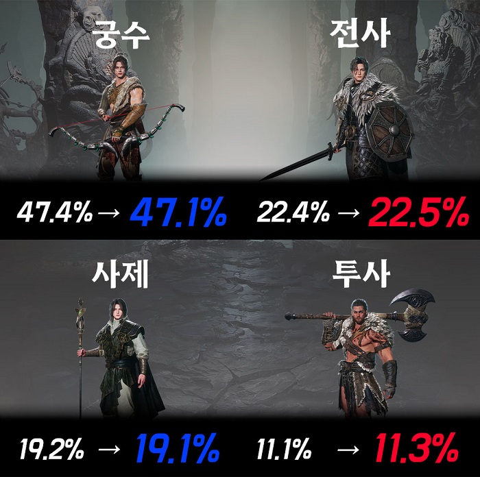 궁수는 여전히 가장 많은 점유율을 차지하고 있으며 전사와 사제, 투사 순으로 분포도를 형성하고 있다.